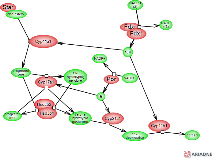 Ariadne Genomics Inc. 11-deoxycortisol ---> cortisol 17alpha-hydroxyprogesterone ---> 11-deoxycortisol pregnenolone ---> progesterone pregnenolone ---> 17-hydroxypregnenolone 17-hydroxypregnenolone ---> 17alpha-hydroxyprogesterone progesterone ---> 17alpha-hydroxyprogesterone NADPH(3) ---> NADP+(3) e e(3) Hsd3b1 Hsd3b2 progesterone 17-hydroxypregnenolone Cyp11b1 Fdx1 Fdxr NADPH(3) NADP+(3) Fdx1 ---> Cyp11a1 Fdx1 ---> Cyp11b1 NADP+ NADPH NADPH ---> e NADPH(3) ---> e(3) Cyp17a1 Por ---> Cyp17a1 Por Cyp21a1 Por ---> Cyp21a1 17alpha-hydroxyprogesterone 11-deoxycortisol cortisol Cyp11a1 NADPH ---> NADP+ cholesterol Star cholesterol ---> pregnenolone pregnenolone