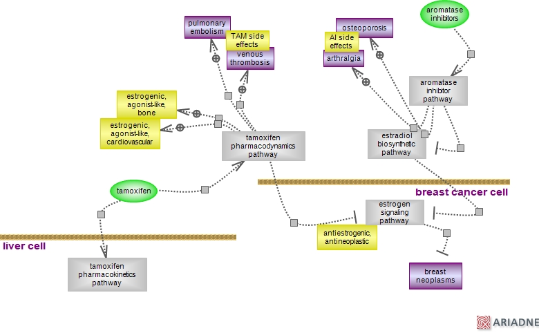 Ariadne Genomics Inc. tamoxifen aromatase inhibitor pathway --+> osteoporosis aromatase inhibitor pathway --+> arthralgia estradiol biosynthetic pathway AI side effects TAM side effects tamoxifen ---> tamoxifen pharmacodynamics pathway tamoxifen ---> tamoxifen pharmacokinetics pathway tamoxifen pharmacodynamics pathway ---| estrogen signaling pathway estrogen signaling pathway ---| breast neoplasms arthralgia osteoporosis pulmonary embolism estrogenic, agonist-like, cardiovascular tamoxifen pharmacodynamics pathway --+> venous thrombosis tamoxifen pharmacodynamics pathway --+> pulmonary embolism estradiol biosynthetic pathway ---| estrogen signaling pathway breast neoplasms tamoxifen pharmacodynamics pathway --+> estrogenic, agonist-like, cardiovascular tamoxifen pharmacodynamics pathway --+> estrogenic, agonist-like, bone aromatase inhibitors ---> aromatase inhibitor pathway venous thrombosis estrogenic, agonist-like, bone aromatase inhibitor pathway ---| estradiol biosynthetic pathway tamoxifen pharmacokinetics pathway tamoxifen pharmacodynamics pathway estrogen signaling pathway aromatase inhibitor pathway antiestrogenic, antineoplastic aromatase inhibitors