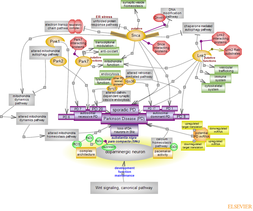 Parkinson's disease (PD) is a progressive neurodegenerative condition of complex etiology exhibiting a range of movement syndromes caused by the selective degeneration of dopaminergic neurons in the substantia nigra pars compacta (SNc). The second most prevalent neurodegenerative disease after Alzheimer's disease, PD is largely sporadic - ~90-95% of cases, the remaining 5-10% being familial; age is a major risk factor. As life span is expected to increase, the incidence of PD is also likely to increase, further adding to the economic and health burden it imposes. Several genes have been implicated in the pathogenicity of PD. The early-onset, autosomal recessive form of PD (AR-PD) is linked to mutations in PINK1 and Parkin (PARK2) proteins, important players in the mitochondrial autophagy and also impacting on mitochondria dynamics. Associated with rare cases of an early-onset autosomal recessive form of PD is DJ-1 (PARK7), a possibly multifunctional protein. Leucine-rich repeat kinase 2 (LRRK2) protein is involved in late-onset, autosomal dominant PD; it accounts for the more common familial type and also represents a risk factor for the idiopathic type. But the key component of PD pathogenesis is alpha-synuclein (SNCA) protein, primarily associated with sporadic PD while a few mutations and gene multiplication are linked to rarer, dominant familial forms. Lewis Bodies (LB) and Lewis Neurites (LN) - pathological hallmarks of PD, are largely composed of aggregated fibrils of beta-sheet rich alpha-synuclein. Unlike PINK1 and Parkin, the function of SNCA, LRRK2 or PARK7, are not well understood. SNCA is thought to play a role in synaptic vesicle homeostasis and mitochondrial function; LRRK2 is thought to play roles in immune and cytoskeletal systems as well as vesicular trafficking and mitochondrial function; PARK7 is thought to have antioxidant and transcriptional modulation properties and also be important for mitochondrial function. Several other genes have been identified with roles in intracellular trafficking/lysosomal/synaptic vesicle functions and PD. Mitochondria dysfunction has long been associated with aging and neurodegeneration; however, this does not explain the selective loss of dopaminergic neurons in SNc. Distinctive features of these neurons include a complex architecture and specific autonomous pacemaker activity which could render them particularly vulnerable to alterations in energy and calcium homeostasis. Differential expression of microRNAs, distinct epigenetic marks and neuronal pigment levels in PD are also documented.