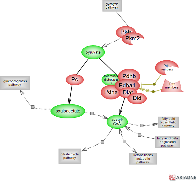 The pyruvate metabolic pathway, the sum of biochemical reactions involving pyruvate, is at the intersection of pathways important for glucose and energy homeostasis. Reaction 10 at the end of glycolysis, carried out by pyruvate kinases, converts phosphoenolpyruvate (PEP) to ATP and pyruvate which can be converted to acetyl-CoA or anaerobically to lactate (considered the end of anaerobic glycolysis). Pyruvate, and to a much lesser extent acetyl-CoA, can also be derived from the breakdown of several amino acids, or, in the case of acetyl-CoA, from fatty acid oxidation. Acetyl-CoA is the only precursor of the citric acid cycle pathway (TCA or Krebs cycle) that completes the oxidation of all metabolic fuels. Alternatively, pyruvate is converted to oxaloacetate (OAA) by pyruvate carboxylase. OAA can have several fates; it can serve as a precursor of PEP in gluconeogenesis, an intermediate in the TCA cycle, or part of a shuttle termed 'pyruvate cycling' with possible implications for glucose-stimulated insulin secretion. The conversion of pyruvate to OAA, carried out by pyruvate carboxylase, or its irreversible decarboxylation to acetyl-CoA, carried out by the pyruvate dehydrogenase complex PDC (described in detail below), are important reactions involving pyruvate. The PDC consists of E1 pyruvate dehydrogenase alpha (Pdha) and beta (Pdhb), E2 - dihydrolipoamide S-acetyltransferase (Dlat) and E3 - dihydrolipoamide dehydrogenase (Dld) enzymes that carry out the five steps of the overall reaction, the regulatory pyruvate dehydrogenase kinases (Pdk) and phosphatases (Pdp) and a protein known as E3bp (Pdhx). A model for the complex suggests a symmetric core composed of multiple copies of E2 and Pdhx to which multiple copies of E1 and E3, several homo or hetero Pdk dimers and Pdp heterodimers are attached. E1 carries out the rate-limiting step in the PDC-catalyzed reactions. Step 1 involves the TPP-dependent decarboxylation of pyruvate followed by acetylation of the lipoyl moiety of E2 in step 2. E2 catalyzes the reaction of step 3 yielding acetyl-CoA. In step 4, the lipoamide group of E2 is restored by E3; E3 is reoxidized in step 5. Pdk(s) inhibit E1 activity; Pdp(s) dephosphorylate the modified serines and restore it. Pdk and Pdp activities are in turn regulated by nutritional states or tissue demands 'sensed' as concentration/ratios of metabolites or by the control these states exert on their transcription.