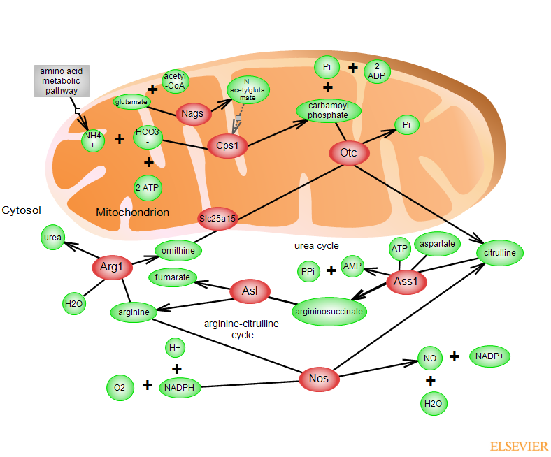 The urea cycle, the first known metabolic cycle, was elucidated by Krebs and Henseleit in 1932. It is composed of seven gene products, and operates predominantly in mammals to eliminate excess nitrogen arising from the breakdown of amino acids through the synthesis in the liver of urea, which is then excreted, while the amino acid carbon skeletons are converted to glucose or glycogen. Mitochondrial carbamoyl-phosphate synthetase (Cps1) condenses ammonia from amino acid catabolism, the first of urea's two nitrogens, and HCO3- to form input molecule carbamoyl phosphate in a reaction requiring two ATP. A related enzyme, CpsII or Cad, uses glutamine as its nitrogen donor and participates in pyrimidine biosynthesis. N-acetylglutamate transferase (Nags) converts Acetyl CoA and glutamate into N-acetylglutamate (NAG), an allosteric activator of Cps1. Nags deficiency leads to hyperammonemia, as Cps1 is inactive in the absence of NAG. Ornithine transcarbamoylase (Otc) then transfers the carbamoyl moiety of carbamoyl phosphate to ornithine to form citrulline in the mitochondrion, which is then exported to the cytosol. Otc deficiency can result in orotic aciduria. Argininosuccinate synthetase (Ass1) carries out the first step in the generation of arginine from citrulline. This is the ATP-dependent linking of citrulline and aspartate, carrying the second urea nitrogen, to form argininosuccinate. The second step is the cleavage of this product by argininosuccinate lyase (Asl) to generate arginine and fumarate. Ass1 and Asl along with nitric oxide synthase (Nos) form an abbreviated version of the cycle called the arginine-citrulline cycle, responsible for generating the key signaling molecule nitric oxide during the conversion of arginine back to citrulline. The final reaction of the urea cycle is carried out by the enzyme arginase. There are two isoenzymes; cytosolic arginase I (Arg1) is found in the liver and is the enzyme involved in the urea cycle. Arginase II is found in mitochondria of peripheral tissues such as the kidney and small intestine. Arginase I hydrolyzes arginine to regenerate ornithine and release for excretion the relatively nontoxic urea, bearing its two nitrogens. The ornithine is then imported into the mitochondrion in exchange for citrulline via the mitochondrial ornithine transporter, Ornt1 or Slc25a15, for another cycle. Slc25a15 defects can result in ornithine translocase deficiency, or hyperornithinemia-hyperammonemia-homocitrullinemia syndrome (HHH syndrome). As stated above, the first cycle enzyme Cps1 is activated by N-acetyl glutamate, whose level is directly related to the rate of amino acid breakdown. Thus, the increased nitrogen from elevated amino acid degradation is effectively dealt with by increased generation of easily eliminated urea by the urea cycle.