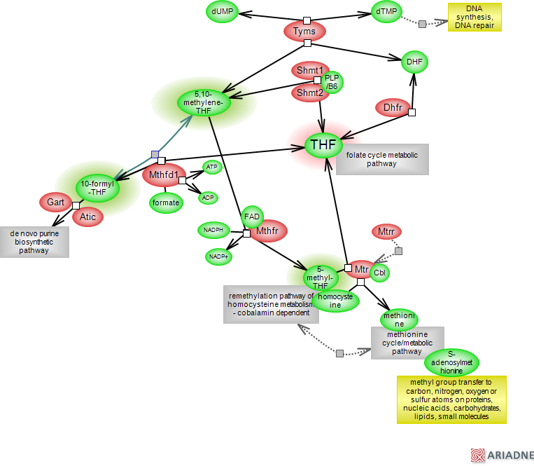 Aldh1l1 autism spectrum disorder , cholestasis , Experimental Liver Cirrhosis , High Myopia , Hypoxia , obesity Aldh1l2 Chemical and Drug Induced Liver Injury , COVID-19 , Experimental Liver Cirrhosis , metabolic dysfunction-associated steatotic liver disease , Neurodevelopmental Disorders Amt Acidoses , genetic disease , glycine encephalopathy , glycine encephalopathy 1 , glycine encephalopathy 2 Atic AICAR Transformylase Inosine Monophosphate Cyclohydrolase Deficiency , blindness , Drug-Related Side Effects and Adverse Reactions , Experimental Arthritis , intellectual disability , osteoporosis , purine-pyrimidine metabolic disorder , rheumatoid arthritis Dhfr acute lymphoblastic leukemia , autistic disorder , Breast Neoplasms , Chemical and Drug Induced Liver Injury , Colorectal Neoplasms , Drug-Related Side Effects and Adverse Reactions , Female Infertility , folic acid deficiency anemia , genetic disease , hepatocellular carcinoma , Hereditary Neoplastic Syndromes , inherited metabolic disorder , Kidney Reperfusion Injury , lung cancer , megaloblastic anemia , Megaloblastic Anemia due to Dihydrofolate Reductase Deficiency , myeloid leukemia , Neoplasm Metastasis , nervous system disease , osteosarcoma , pancytopenia , rheumatoid arthritis , Spontaneous Abortions Dmgdh dimethylglycine dehydrogenase deficiency , hepatocellular carcinoma Folh1 abdominal aortic aneurysm , amyotrophic lateral sclerosis type 1 , cerebral infarction , Prostatic Neoplasms Ftcd Burkitt lymphoma , Experimental Liver Cirrhosis , genetic disease , glutamate formiminotransferase deficiency , intellectual disability , myoepithelioma Gart Animal Disease Models , Down syndrome , esophageal atresia/tracheoesophageal fistula , lung adenocarcinoma , rheumatoid arthritis Gnmt Chronic Hepatitis , glycine N-methyltransferase deficiency , hepatitis , hepatocellular carcinoma , hyperhomocysteinemia , hypermethioninemia , Liver Neoplasms , metabolic dysfunction-associated steatotic liver disease , Prostatic Neoplasms Mtfmt combined oxidative phosphorylation deficiency 15 , Dwarfism , genetic disease , Leigh disease , microcephaly , mitochondrial complex I deficiency , nuclear type mitochondrial complex I deficiency 27 , Waardenburg Syndrome Type 2F Mthfd1 abdominal aortic aneurysm , cleft lip , cleft palate , Combined Immunodeficiency and Megaloblastic Anemia with or without Hyperhomocysteinemia , developmental cardiac valvular defect , Down syndrome , Fetal Growth Retardation , Folate-Sensitive Neural Tube Defects , genetic disease , neural tube defect , placental abruption , severe combined immunodeficiency , spina bifida , tetralogy of Fallot Mthfd1l Craniofacial Abnormalities , neural tube defect Mthfd2 congestive heart failure , COVID-19 , hepatocellular carcinoma , Hodgkin's lymphoma Mthfr abdominal aortic aneurysm , acute kidney failure , acute lymphoblastic leukemia , acute myeloid leukemia , Albuminuria , alcoholic liver cirrhosis , allergic disease , alopecia , Alzheimer's disease , amyotrophic lateral sclerosis , anemia , angle-closure glaucoma , ankylosing spondylitis , aphthous stomatitis , Arsenic Poisoning , Arterial Occlusive Diseases , asthma , atherosclerosis , attention deficit hyperactivity disorder , autism spectrum disorder , autistic disorder , B-Cell Chronic Lymphocytic Leukemia , Banti's Syndrome , bipolar disorder , brain ischemia , Breast Neoplasms , Budd-Chiari syndrome , cardia cancer , cardiovascular system disease , carotid stenosis , cataract , cerebral infarction , cervical cancer , Chemical and Drug Induced Liver Injury , cholangiocarcinoma , chronic kidney disease , chronic myeloid leukemia , clear cell renal cell carcinoma , cleft lip , clubfoot , coarctation of the aorta , Cognitive Dysfunction , Colonic Neoplasms , Colorectal Neoplasms , congenital heart disease , Conotruncal Cardiac Defects , coronary artery disease , Coronary Disease , coronary restenosis , Crohn's disease , Cytomegalovirus Infections , depressive disorder , Developmental Disabilities , dextro-looped transposition of the great arteries , diabetes mellitus , diabetic angiopathy , Diabetic Nephropathies , diabetic retinopathy , diffuse large B-cell lymphoma , Down syndrome , Drug Eruptions , Drug-Related Side Effects and Adverse Reactions , end stage renal disease , Endometrial Neoplasms , epilepsy with generalized tonic-clonic seizures , Experimental Diabetes Mellitus , eye disease , factor VIII deficiency , familial Mediterranean fever , Female Infertility , Folate-Sensitive Neural Tube Defects , follicular lymphoma , gastrointestinal stromal tumor , gastrointestinal system disease , genetic disease , glomerulonephritis , graft-versus-host disease , Graves' disease , Habitual Abortions , Hearing Loss , Helicobacter Infections , Hematologic Neoplasms , hematopoietic system disease , hepatic veno-occlusive disease , hepatitis B , hepatocellular carcinoma , hyperhomocysteinemia , hyperthyroidism , hypopituitarism , hypothyroidism , inflammatory bowel disease , Inherited Blood Coagulation Disease , intellectual disability , intracranial sinus thrombosis , ischemia , kidney disease , kidney failure , Kuhnt-Junius degeneration , Left Ventricular Hypertrophy , Leukoencephalopathies , leukopenia , liver benign neoplasm , liver cirrhosis , liver disease , Lung Neoplasms , lung small cell carcinoma , lymphoma , male infertility , Malnutrition , Maxillofacial Abnormalities , Meniere's disease , metabolic dysfunction-associated steatotic liver disease , Methylenetetrahydrofolate Reductase Deficiency , Microsatellite Instability , Microvascular Angina , migraine , migraine with aura , mitral valve disease , Mthfr Deficiency, Thermolabile Type , mucositis , multiple myeloma , myeloid neoplasm , myelomeningocele , myocardial infarction , Necrosis , Neoplasm Metastasis , nephroblastoma , nephrosclerosis , nervous system disease , neural tube defect , neutropenia , non-arteritic anterior ischemic optic neuropathy , non-Hodgkin lymphoma