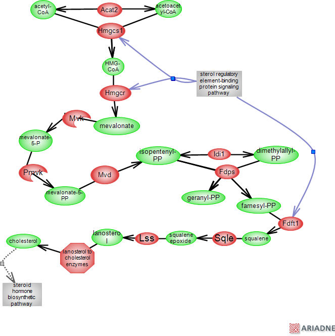 Acat2 arteriosclerosis , coronary artery disease , Cytosolic Acetoacetyl-CoA Thiolase Deficiency , Hypercholesterolemia , Metabolic Syndrome Cyp51 Antley-Bixler syndrome , cataract , diabetes mellitus , Hypercholesterolemia Dhcr24 Alzheimer's disease , autism spectrum disorder , COVID-19 , Desbuquois dysplasia , desmosterolosis , genetic disease , Hydrops Fetalis , lipid metabolism disorder , Q fever , schizophrenia Dhcr7 acute promyelocytic leukemia , Animal Disease Models , autistic disorder , Behcet's disease , genetic disease , hepatoblastoma , intellectual disability , liver cirrhosis , Metabolic Bone Diseases , microcephaly , Muscle Hypotonia , primary microcephaly , Smith-Lemli-Opitz syndrome , Vitamin D Deficiency Ebp autosomal recessive congenital ichthyosis , chondrodysplasia punctata , connective tissue disease , Desbuquois dysplasia , Developmental Disease , genetic disease , MEND syndrome , X-linked chondrodysplasia punctata 1 , X-linked chondrodysplasia punctata 2 Fdft1 alcohol use disorder , cannabis abuse , cataract , Cocaine-Related Disorders , hepatocellular carcinoma , phencyclidine abuse , Squalene Synthase Deficiency Fdps alcohol use disorder , Porokeratosis 9, Multiple Types , Postmenopausal Osteoporosis Ggps1 MUSCULAR DYSTROPHY, CONGENITAL HEARING LOSS, AND OVARIAN INSUFFICIENCY SYNDROME , neuromuscular disease , sensorineural hearing loss , Tubular Aggregate Myopathies Hmgcr acute kidney failure , Acute Lung Injury , Alzheimer's disease , asthma , attention deficit hyperactivity disorder , autoimmune disease , autosomal recessive limb-girdle muscular dystrophy type 28 , Bacteremia , Brain Injuries , Chediak-Higashi syndrome , chronic kidney disease , coronary artery disease , Coronary Disease , dementia , diabetes mellitus , drug-induced hepatitis , end stage renal disease , Experimental Arthritis , Experimental Autoimmune Encephalomyelitis , Experimental Autoimmune Neuritis , Experimental Diabetes Mellitus , Experimental Liver Cirrhosis , Gallstones , genetic disease , hepatocellular carcinoma , Huntington's disease , Hypercholesterolemia , Hyperlipoproteinemia Type II , intermediate coronary syndrome , limb-girdle muscular dystrophy , metabolic dysfunction and alcohol associated liver disease , metabolic dysfunction-associated steatotic liver disease , Metabolic Syndrome , mevalonic aciduria , morbid obesity , muscular disease , Parkinson's disease , premature menopause , pulmonary hypertension , Q fever , Reperfusion Injury , stroke , Surgical Wound Dehiscence , type 2 diabetes mellitus , uveitis , Wilson disease Hmgcs1 Experimental Diabetes Mellitus , obesity , rigid spine muscular dystrophy 1 , Spinal Cord Compression Hsd17b7 polycystic ovary syndrome Lbr Anadysplasia-Like, Spontaneously Remitting Spondylometaphyseal Dysplasia , asphyxiating thoracic dystrophy , asphyxiating thoracic dystrophy 1 , connective tissue disease , Desbuquois dysplasia , genetic disease , Greenberg dysplasia , ichthyosis vulgaris , lymphopenia , Pelger-Huet anomaly , PELGER-HUET ANOMALY WITH MILD SKELETAL ANOMALIES , primary biliary cholangitis , Retrognathia , Reynolds Syndrome , systemic lupus erythematosus Lipa cholesterol ester storage disease , coronary artery disease , COVID-19 , Fibrosis , lysosomal acid lipase deficiency , Niemann-Pick disease type C1 , Wolman disease , Wolman Disease with Hypolipoproteinemia and Acanthocytosis Lss alopecia-mental retardation syndrome 4 , cataract , cataract 44 , genetic disease , Hypercholesterolemia , hypotrichosis 14 , lipid storage disease , Q fever Msmo1 genetic disease , Microcephaly, Congenital Cataract, and Psoriasiform Dermatitis Mvd Hypercholesterolemia , porokeratosis , Porokeratosis 7, Multiple Types Mvk Arthralgia , Chediak-Higashi syndrome , ectodermal dysplasia 1 , exanthem , Fever , fundus dystrophy , genetic disease , hepatocellular carcinoma , hyperimmunoglobulinemia D periodic fever syndrome , Inflammation , lipid metabolism disorder , methylmalonic acidemia cblB type , mevalonic aciduria , nemaline myopathy 5 , nemaline myopathy 5A , nemaline myopathy 6 , Porokeratosis 3, Multiple Types , retinitis pigmentosa 1 Nsdhl autosomal recessive congenital ichthyosis , Bloch-Sulzberger syndrome , CHILD syndrome , CK syndrome , connective tissue disease , Desbuquois dysplasia , epilepsy , genetic disease , head and neck squamous cell carcinoma , Hearing Loss , X-linked chondrodysplasia punctata 1 Pmvk genetic disease , porokeratosis , Porokeratosis 1, Multiple Types Sc5d genetic disease , intellectual disability , Lathosterolosis , liver disease Soat1 aortic atherosclerosis , atherosclerosis , Chagas disease , Experimental Liver Cirrhosis , familial hyperlipidemia , hepatocellular carcinoma , type 2 diabetes mellitus , xanthomatosis Sqle cholelithiasis , Experimental Liver Neoplasms , Hypercholesterolemia , obesity
