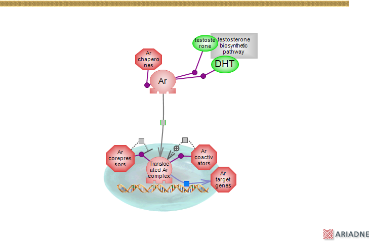 The androgen signaling pathway plays important roles in the development and maintenance of male phenotype and reproductive functions and in a range of other processes in nonreproductive tissues. Testosterone, the main androgen, is primarily synthesized in the testes; others are synthesized in the adrenal gland and can be converted to testosterone in peripheral tissues. In some of the target cells, testosterone can be converted to its very potent metabolite dehydrotestosterone (DHT). Like all steroid hormones, androgens are derived from cholesterol; their biosynthesis is tightly regulated by the hypothalamus-pituitary-gonadal axis. Testosterone or DHT bind to the androgen receptor to initiate the androgen signaling pathway. The receptor is a member of the nuclear receptor superfamily of ligand activated transcription factors. It is composed of several functional domains: the N-terminal regulatory domain (NTD) containing glutamine (CAG) and glycine repeats, the DNA binding domain (DBD), a hinge region and the ligand binding domain (LBD). In the absence of the ligand the receptor is localized in the cytoplasm and complexed with heat shock proteins. The interactions appear to involve the LBD domain of the receptor and the role of the chaperones is to maintain the receptor into a partially unfolded but ligand primed state. Several such chaperones are believed to constitute a minimal heterocomplex for all steroid hormone receptors, known as the 'foldosome'. The formation of the foldosome is thought to proceed in an assembly-line fashion. Upon ligand binding, the complex translocates to the nucleus where the receptor dissociates from the chaperones. The DBD contains two zinc-fingers of which one appears to mediate recognition of androgen-response elements (ARE) while the second stabilizes the DNA-bound receptor and facilitates dimerization. The receptor binds to the direct-repeat response elements as head-to-head dimer. A wide array of coregulators interacts with the receptor to modulate its transcriptional activity; the NTD domain is a major site of interaction. There are over 130 potential coregulators acting as coactivators or corepressors that belong to several distinct functional classes - chromatin remodeling, histone and various protein modification types, cell cycle and DNA repair, general and specific transcription factors, structural proteins and others. Various methods have led to their identification but for many further experiments are necessary to ascertain a bona fide androgen receptor coregulator function. Important issues to elucidate are: how the receptor accommodates such an array of interactions, how these interactions integrate into the tapestry of androgen signaling pathway. Up-regulation of the pathway has been observed in prostate cancer; it is mostly due to amplification of the receptor or acquired mutations that render the receptor promiscuous and responsive to a variety of molecules. In addition, changes in testosterone, DHT and/or coactivators levels have also been proposed to play a role in the enhanced androgen signaling activity associated with the disease.