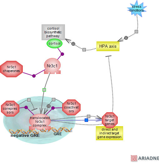 Glucocorticoid steroid hormones, cortisol in humans, play essential roles in the regulation of immune responses, metabolism, development as well as cognitive processes. Cortisol promotes the expression of anti-inflammatory proteins while repressing the expression of pro-inflammatory ones, stimulates gluconeogenesis in liver and the breakdown of fat in the adipose tissue. The synthesis of cortisol is under the control of the hypothalamus-pituitary-adrenal (HPA) axis. In response to various stresses, the hypothalamus releases corticotropin-releasing hormone (CRH) whose signaling results in activation of protein kinase A (PKA) pathway and the expression and release of pro-opiomelanocortin (POMC) gene from the pituitary. Processing of POMC gives rise to several peptides of which adrenocorticotropin (ACTH), specifically binding to melanocortin receptor type 2 (Mc2r) also setting in motion PKA, prompts the expression of steroidogenic genes and the secretion of cortisol from the adrenal cortex. Cortisol binds the glucocorticoid receptor Nr3c1, a nuclear hormone receptor. In the absence of ligand Nr3c1 is predominantly cytoplasmic and dynamically complexed with a chaperone/co-chaperone machinery that is critical for its function and turnover. Like the other members of the nuclear receptor superfamily, Nr3c1 is modular consisting of trans-activation, DNA-binding (DBD) and ligand-binding (LBD) domains. The N-terminal trans-activation domain 1 (AF-1) is ligand independent whereas a second domain (AF-2), embedded in the LBD, is ligand dependent. The DBD, which contains two zinc fingers motifs, is the most conserved domain within the family. Two main receptor isoforms are generated through alternative splicing of which the alpha represents the classic glucocorticoid receptor. The beta isoform, thought to be largely disordered, does not bind glucocorticoids and while residing in the nucleus does not regulate gene expression. Yet, if co-expressed with the alpha isoform, it can act as an inhibitor of the classic receptor, suggesting a possible modulator role. Additional splice and translational isoforms have been reported. Upon ligand binding, Nr3c1 translocates to the nucleus where it binds as a homodimer to specific glucocorticoids response elements (GRE) or, possibly as a monomer, to other transcription factors to enhance or downregulate the transcription of many genes. The receptor may bind negative GRE as another mechanism of repression. In addition, Nr3c1 interacts with many coactivators and corepressors that modulate the outcomes of its function. Nr3c1is a substrate for many post-translational modifications that affect in various ways its function and fate. The receptor plays important roles in the negative feedback loop the pathway provides for the upstream components of the HPA axis. A notable example is the repression of POMC gene expression. While POMC, and also CRH genes appear to harbor negative GREs, Nr3c1 has been reported to bind to and antagonize the function of Nr4a1, an orphan nuclear receptor and transcriptional mediator of POMC expression. The Nr3c1 coactivator Brg1 is crucial for the interaction; the complex can then recruit Hdac2 and silence gene expression. Glucocorticoid deficiency or excess has been associated with several pathophysiological conditions.