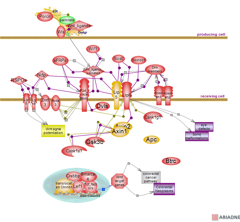 To access the diagram for the normal canonical Wnt signaling, click here . Apc gene is mutated in both the sporadic and the inherited form of colorectal cancer; frameshift, nonsense or splice-site mutations result in a truncated Apc protein. Axin1 and 2 loss-of-function mutations in colorectal cancer have been reported but they are relatively rare. Beta-catenin mutations cluster in a region of the amino-terminus; they either result in a deletion of an N-terminal fragment or disrupt the phosphorylation of key residues within this region. Mutated beta-catenin has been found in colorectal cancer and with a lower frequency in other types of cancer. For instance, mutations in beta-catenin have been associated with type 1 endometrial cancer. Apc, Axins and beta-catenin mutations result in a constitutively active beta-catenin in the nucleus leading to deregulated expression of Wnt target genes. Other mutations involve the Lrp5 receptor and link to osteoarthritis and low bone mass syndrome as well as eye defects. Mutations in some of the Wnt ligands and/or frizzled receptors (not shown) have been associated with renal failure, cardiovascular and neurodegenerative diseases. A member of Tcf family, Tcf72l, known as Tcf-4 is a strong susceptibility locus for type 2 diabetes. Mutated genes are color coded.