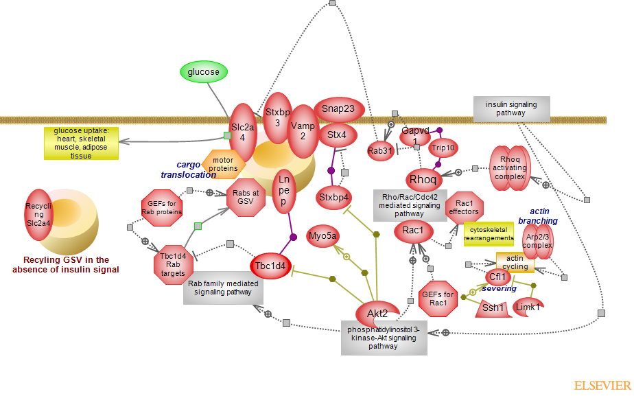 The interaction of TBC1D4 with Lnpep, known as Irap, may help localize it to GSV. Lnpep and Vamp2 are associated with GSVs. Vamp2 ¿ a v-SNARE, complexes with the t-SNARE Stx4 and Snap23 to promote docking/fusion events; fusion further requiring Stxbp3. In the basal state, Stxbp4 binds Stx4 and inhibits Stx4 interaction with Snap23 and Vamp2. Insulin stimulation leads to Stxbp4 dissociation and is dependent on phosphorylation of Stxbp4 by Akt2. Myo5a is another substrate of Akt2; phosphorylation promotes association with actin and inhibition of Myo5a diminishes insulin dependent Glut4 translocation and glucose uptake. Likely, more molecular details are going to emerge and further add to the complexity of insulin mediated uptake of glucose. In type 2 diabetes (T2D), in addition to an impaired insulin secretion, there is an insufficient, inadequate response to insulin. Several rare mutations have been identified such as rare truncation of TBC1D4 associated with obesity or polymorphism in RapGef1, the Gef within the activating complex of Rhoq, associated with type 2 diabetes, in addition to the Akt2 mutations involved in severe insulin resistance.