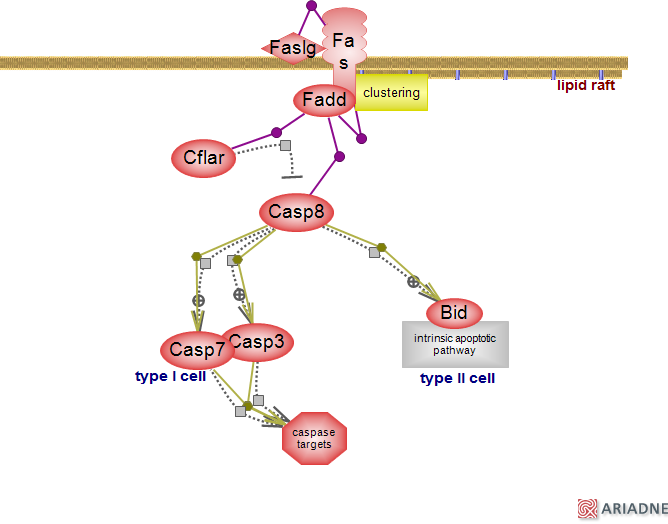 FasL mediated signaling is one of the major extrinsic apoptotic pathways engaging the death receptors. FasL (official symbol Faslg) and its receptor Fas, also known as CD95/APO-1, belong to the tumor necrosis superfamily (TNF) of ligands and receptors. The receptor contains an extracellular CRD (cysteine-rich domain) while the cytoplasmic part contains a DD (death domain) responsible for the interaction with adapter/effector proteins. Fas, which is ubiquitously expressed, is found at the plasma membrane as a pre-formed homotrimer. FasL expression on the other hand is cell restricted and highly regulated. Like the other ligands in the superfamily, FasL is membrane-bound and subject to cleavage by metalloproteases. However, unlike other ligands, the soluble form of FasL does not appear to be functional and may even inhibit the membrane-bound FasL mediated apoptosis (soluble, trimeric Tfn triggers trimerization of the receptor; membrane-bound or soluble Trail are biologically active molecules that homotrimerize). It is thought that redistribution of Fas within membrane domains such as lipid rafts may induce an apoptotic signal independent of FasL; however FasL (or agonistic antibodies) has been shown to trigger apoptosis. The ligand-receptor interaction may involve multimerization and formation of an active DISC (death-inducing signaling complex) via DD mediated interaction with Fadd requires oligomerization and clustering. Via its second functional domain DED (death effector domain), Fadd recruits the initiator caspase Casp8 to the DISC where it is activated. While in human cells and in some cell lines Casp10 may also be recruited, Casp8 is the main initiator caspase which once activated, will in turn activate the effector/executioner caspases or the BH3-only protein Bid. Direct activation of effector/executioner caspases is characteristic of the so-called type I cells. Additional amplification via the intrinsic, mitochondrial, intrinsic apoptosis mediated through the activation of Bid is a feature of type II cells. However, the distinction between type I cells such as lymphocytes and type II such as hepatocytes in the FasL/Fas induced apoptosis is not clear. Cflar protein (known as Flip) can also be recruited to the DISC where it antagonizes the activation of Casp8. DED-DED interactions mediate the recruitment; the inhibition is thought to be due to competition for Fadd binding. There are several Cflar variants resulting from alternative mRNA splicing of which three are expressed at the protein level. Generally, Cflar has an anti-apoptotic effect. However, under certain circumstances one of the variants appears to actually promote FasL/Fas dependent apoptosis. FasL is mostly expressed in lymphocytes and the apoptotic pathway it promotes plays important roles in the immune system.