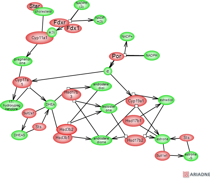 Cyp11a1 46, XY Disorders of Sex Development , Adrenal Insufficiency , autism spectrum disorder , Brain Injuries , Cardiomegaly , chronic obstructive pulmonary disease , congenital adrenal hyperplasia , Congenital Adrenal Hyperplasia due to 21 Hydroxylase Deficiency , congenital adrenal insufficiency , Disorders of Environmental Origin , Endometrial Neoplasms , Experimental Diabetes Mellitus , Fetal Growth Retardation , genetic disease , hyperglycemia , hypertension , hypogonadism , Lipoid Congenital Adrenal Hyperplasia , nephrosis , sciatic neuropathy , status epilepticus , type 2 diabetes mellitus Cyp17a1 17,20-Lyase Deficiency, Isolated , amenorrhea , breast cancer , Breast Neoplasms , cholelithiasis , congenital adrenal hyperplasia , Congenital Adrenal Hyperplasia due to 21 Hydroxylase Deficiency , Congenital Adrenal Hyperplasia, Type 5 , Experimental Liver Cirrhosis , Female Infertility , gallbladder cancer , genetic disease , Genetic Predisposition to Disease , hepatocellular carcinoma , Hyperkalemia , hypogonadism , hypopituitarism , male infertility , malignant hypertension , metabolic dysfunction-associated steatotic liver disease , Neuralgia , Oligomenorrhea , osteoporosis , ovarian cyst , pancreatic cancer , polycystic ovary syndrome , primary ovarian insufficiency , prostate cancer , Prostatic Neoplasms , sciatic neuropathy , sexual health disorder , urinary bladder cancer Cyp19a1 adenocarcinoma , Alzheimer's disease , amenorrhea , aromatase excess syndrome , autism spectrum disorder , autistic disorder , bladder neck obstruction , bone resorption disease , breast cancer , Breast Neoplasms , Critical Illness , Diabetic Nephropathies , endometrial cancer , endometriosis , Esophageal Neoplasms , esophagus adenocarcinoma , Experimental Diabetes Mellitus , Female Infertility , Fibrosis , gestational diabetes , hypertension , hypogonadism , hypopituitarism , hypothyroidism , Kidney Reperfusion Injury , Knee Osteoarthritis , Neoplasm Metastasis , osteoporosis , ovarian cancer , ovarian disease , placental insufficiency , polycystic ovary syndrome , Postmenopausal Osteoporosis , prostate carcinoma in situ , Prostatic Neoplasms , prostatitis , protein-energy malnutrition , Recurrence , Reperfusion Injury , Sexual Infantilism , Sjogren's syndrome , steatotic liver disease , Tissue Adhesions , urethral obstruction , urinary bladder cancer Fdx1 pancreatitis Fdxr Arterial Occlusive Diseases , Auditory Neuropathy , fundus dystrophy , genetic disease , Multiple mitochondrial dysfunctions syndrome 9A , Multiple mitochondrial dysfunctions syndrome 9B , optic atrophy , OPTIC ATROPHY-ATAXIA-PERIPHERAL NEUROPATHY-GLOBAL DEVELOPMENTAL DELAY SYNDROME Hsd17b1 autism spectrum disorder , endometriosis , invasive ductal carcinoma , Prostatic Neoplasms , Spontaneous Abortions Hsd17b2 Endometrial Neoplasms , endometriosis , Experimental Liver Cirrhosis Hsd17b3 17-beta hydroxysteroid dehydrogenase 3 deficiency , Alzheimer's disease , disorder of sexual development , Prostatic Neoplasms , type 2 diabetes mellitus Hsd3b1 Alzheimer's disease , autism spectrum disorder , hyperprolactinemia , hypertension , hypogonadism , hypospadias , hypothyroidism , polycystic ovary syndrome , Prostatic Neoplasms , sciatic neuropathy , type 2 diabetes mellitus Hsd3b2 Adrenal Hyperplasia 2 , Alzheimer's disease , congenital adrenal hyperplasia , cryptorchidism , Ependymomas , genetic disease , hepatocellular carcinoma , hyperprolactinemia , hypertension , hypospadias , Hypospadias 1, X-Linked , Paranoid Disorders , polycystic ovary syndrome , Prostatic Neoplasms Por 46, XY Disorders of Sex Development , amenorrhea , Antley-Bixler syndrome , Antley-Bixler syndrome with disordered steroidogenesis , congenital adrenal hyperplasia , Congenital Adrenal Hyperplasia due to 21 Hydroxylase Deficiency , congestive heart failure , cytochrome P450 oxidoreductase deficiency , Desbuquois dysplasia , disorder of sexual development , Fine-Lubinsky Syndrome , genetic disease , gliosarcoma , Hirschsprung's disease , Hypotension , learning disability , Lung Injury , Musculoskeletal Abnormalities , Neoplastic Cell Transformation , neural tube defect , primary ovarian insufficiency , urinary bladder cancer Star Cardiomegaly , congenital adrenal hyperplasia , Disorders of Environmental Origin , Endometrial Neoplasms , Experimental Diabetes Mellitus , Fetal Growth Retardation , Fever , genetic disease , hypogonadism , hypothyroidism , Lipoid Congenital Adrenal Hyperplasia , nephrosis , polycystic ovary syndrome , syndactyly-telecanthus-anogenital and renal malformations syndrome , type 2 diabetes mellitus Sts alcoholic hepatitis , attention deficit hyperactivity disorder , autism spectrum disorder , COVID-19 , cryptorchidism , Experimental Diabetes Mellitus , genetic disease , hypertension , Inflammation , Insulin Resistance , obesity , rheumatoid arthritis , steatotic liver disease , Weight Gain , X-linked ichthyosis Sult1e1 alcoholic hepatitis , breast cancer , Chemical and Drug Induced Liver Injury , endometrial cancer , Experimental Liver Cirrhosis , liver disease , Neoplasm Metastasis , Prostatic Neoplasms , Reperfusion Injury Sult2a1 Experimental Liver Cirrhosis , prostate cancer , Prostatic Neoplasms