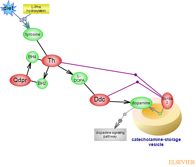 to two subtypes: D1-like type with dopamine receptors 1 (DRD1) and 5 (DRD5) and D2-like type with dopamine receptors 2 (DRD2), 3 (DRD3) and 4 (DRD4). They differ in expression and ligand affinity, and the alpha subunits of heterotrimeric G proteins to which they couple. Dopaminergic (DA-producing) neurons are primarily in modbrain areas such as the substantia nigra pars compacta (SNc) and the ventral tegmental areas (VTA). The precursor of all catecholamines is L-tyrosine which can be derived from the diet or from the hydroxylation of L-phenylalanine. Tyrosine hydroxylase (Th), an iron-containing, biopterin-dependent soluble enzyme catalyzes the conversion of tyrosine to dihydroxy-L-phenylalanine (L-DOPA) in the rate-limiting step of the reaction. The cofactor tetrahydrobioterin (BH4) is used in the reaction and the resulting dihydrobiopterin (BH2) is reconverted to BH4 by dihydropteridine reductase. Tetrahydrobiopterin can also be synthesized de novo from the purine nucleotide GTP. Th expression and activity is regulated in manifold ways. The short term control of Th activity is due to product(s)-based inhibitory feedback and activation by phosphorylation; several kinases and phosphatases have been implicated in modulating the activity of the enzyme. Long term control involves regulation of transcription and epigenetic mechanisms, stability and in humans, alternative splicing giving rise to four different isoforms. Th exists as a tetramer. Each monomer consists of a regulatory N-terminal stretch followed by the catalytic and tetramerization domains. Access the structure of the catalytic domain; or the structures of both catalytic and tetramerization domains. L-DOPA is converted to dopamine (DA) by the pyridoxal phosphate-dependent aromatic L-amino acid decarboxylase (Ddc). Both Th and Ddc interact with vesicle protein Slc18a2, which couples DA synthesis with transport into vesicles. Cytosolic DA is prone to oxidation to generate toxic quinones; the low pH inside the vesicle protects DA from oxidation. DA can be converted to norepinephrine which in turn, can be methylated to yield epinephrine. SNc DA neurons are selectively lost in the neurodegenerative Parkinson disease (PD). Interestingly, Th is an interacting partner for alpha-synuclein, a major culprit in PD. To see the ontology report for annotations GViewer and download, click here...(less)