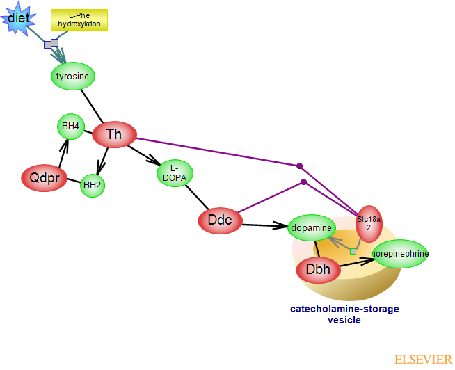 nerve terminals and also adrenal medulla; hypotension or hypoglycemia, shock or emotional distress, prompt the synthesis of epinephrine, primarily in adrenal chromaffin cells. Dopamine ¿ the other catecholamine, whose synthesis takes place in cholinergic neurons, is a precursor for both norepinephrine and epinephrine but its roles are distinct. Catecholamine synthesis and the activities of participating enzymes are regulated by neuronal and humoral mechanisms. The precursor of all catecholamines is L-tyrosine which can be derived from the diet or from the hydroxylation of L-phenylalanine. Tyrosine hydroxylase (Th), an iron-containing, biopterin-dependent soluble enzyme catalyzes the conversion of tyrosine to dihydroxy-L-phenylalanine (L-DOPA) in the rate-limiting step of the reaction. The cofactor tetrahydrobioterin (BH4) is used in the reaction and the resulting dihydrobiopterin (BH2) is reconverted to BH4 by dihydropteridine reductase. Tetrahydrobiopterin can also be synthesized de novo from the purine nucleotide GTP. Th expression and activity is regulated in manifold ways. The short term control of Th activity is due to product(s)-based inhibitory feedback and activation by phosphorylation; several kinases and phosphatases have been implicated in modulating the activity of the enzyme. Long term control involves regulation of transcription and epigenetic mechanisms, stability and in humans, alternative splicing giving rise to four different isoforms. Th exists as a tetramer. Each monomer consists of a regulatory N-terminal stretch followed by the catalytic and tetramerization domains. Access the structure of the catalytic domain; or both catalytic and tetramerization domains. L-DOPA is converted to dopamine (DA) by the pyridoxal phosphate-dependent aromatic L-amino acid decarboxylase (Ddc). Both Th and Ddc interact with vesicle protein Slc18a2, which couples DA synthesis with transport into vesicles. Cytosolic DA is prone to oxidation to generate toxic quinones; the low pH inside the vesicle protects DA from oxidation. DA can be converted to norepinephrine which in turn, can be methylated to yield epinephrine. DA stored in vesicles is converted to norepinephrine by Dbh - a copper- and ascorbate-dependent enzyme that is found either in soluble or as a membrane-bound form within storage vesicles. To see a structure containing a fragment of this enzyme, click here.The soluble Pnmt converts norepinephrine to epinephrine using S-adenosyl-methionine (SAM) as a cofactor. To see the ontology report for annotations, GViewer and download, click here...(less)