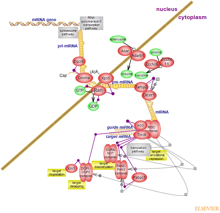 anded arms flanking the hairpin. Many have a cap and a polyA tail indicative of polymerase II transcription. The majority of miRNA are products of pol II transcription; less frequently, of pol III. In the nucleus, the pri-miRNA is cleaved to a ~60-70 nucleotides stem-looped precursor (pre-miRNA) by the microprocessor complex. The core components of the complex are the RNase III Drosha (Rnasen) and its cofactor Dgcr8, essential for determining the cleavage site. The two RNase domains of the enzyme cleave the 5¿ and 3¿ single strands about 11 bp away from the junction of single- and double-stranded RNA. In a Drosha-independent manner, miRNAs can be generated from pre-miRNA-like introns, called mirtrons; the Drosha-mediated route is the canonical miRNA pathway. pre-miRNA is recognized by Xpo5 - a member of the nuclear transport receptor family which, in conjunction with GTP-bound Ran, transports it into the cytoplasm. The HEAT repeats of Xpo5 are important for both pre-miRNA and GTP-Ran binding. Hydrolysis of GTP to GDP in the cytoplasm leads to release of cargo. In the cytosol, pre-miRNA is processed by Dicer1 - the other RNase III in the pathway. Dicer1, aided by Tarbp2 (Trbp), cleaves the hairpin-loop of pre-miRNA to produce a ~22 nucleotide duplex. Binding of Tarbp2 to the helicase-like domain of Dicer induces conformational changes that abrogate its inhibitory effect. The relative thermodynamic stability of the base pairs at the ends of the duplex determines which strand will become the mature or guide strand. The strand with the less stable 5'end becomes the guide of the miRNA-induced silencing complex (RISC) - the effector complex of miRNA pathway. Members of the argonaute family of proteins are core components of RISC complex; its assembly however, is not well understood and appears to vary between species. In mammals, four proteins of the AGO subfamily with redundant functions are involved in miRNA and siRNA pathways. The ~100kDa proteins contain characteristic PAZ, MID (middle) and PIWI domains; PAZ and MID contact the 3' and 5' end of miRNA, respectively. The C-terminal PIWI domain may have endonucleolytic activity, while the N-terminal domain facilitates duplex unwinding. Drosha and Dicer1 generate varied length products; these other length variants, called isomiRs may vary in their gene expression regulation or may regulate the same targets as the canonical miRNAs.
