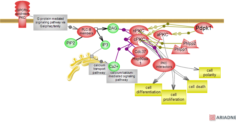 The protein kinase C family (PKC) comprises ~2% of the human kinome and can be subdivided into three subclasses: conventional or classical (cPKC), novel (nPKC) and atypical (aPKC). All isoforms contain a C-terminal kinase domain and an N-terminal autoinhibitory pseudosubstrate but differ in their responsiveness to second messengers. A tandem DAG-sensitive C1 domain is present in cPKC and nPKC with the latter group displaying a higher sensitivity. The C2 domain is Ca2+ sensitive in cPKC only. The single C1domain in aPKC is DAG-insensitive; this group depends on other lipids or protein-protein interactions for functional regulation. Collectively, the pathway regulates cell proliferation, differentiation, polarity and death and plays a role in the cardiac, immune and nervous systems. PKC signaling is initiated downstream of ligand-activated G protein coupled receptors (GPCR) that trigger the signal transduction mediated by the Galphaq family of heterotrimeric G proteins. The Galphaq activates the beta subtype of phospholipase C (PLC; PLC-B). Other PLC subtypes can be activated downstream of receptor tyrosine kinases (RTK) with potential role in PKC activation. PLC catalyzes the hydrolysis of PIP2 to produce DAG and IP3; IP3 promotes calcium release from ER. Calcium permeates almost every aspect of cellular processes - its uptake, storage, release, buffering and sensing is mediated by a broad range of transporters and channels, calcium-binding and signaling molecules that together constitute the 'calcium signaling kit' within the two inextricably connected pathways of calcium transport and signaling. Newly synthesized PKCs need priming for maturation - a process that involves a series of tightly controlled phosphorylation events. The Hsp90 chaperone and Cdc37co-chaperone are required for the proper processing of cPKC and nPKCs. Pdpk1 phosphorylates the activation loop of PLC, an event that is constitutive for cPKC and nPKCs but agonist dependent for aPKCs. A second phosphorylation at the turn motif, completes the maturation of PKC and is dependent on mTORC2 complex. Whether the role of mTORC2 is direct or indirect, via activation of an upstream kinase, is currently unclear. Mature, fully phosphorylated PKCs are in the cytoplasm and bound to the autoinhibitory pseudosubstrate. Signals that release calcium facilitate recruitment to the plasma membrane followed by DAG binding or there is direct membrane recruitment via high DAG affinity. At the membrane, PKC is in an open conformation which promotes release of pseudosubstrate and binding of a variety of interactors - adaptors or scaffolds and other binding partners and substrates, in order to fulfill many cellular tasks. The open conformation can also promotes dephosphorylation by members of PPM phosphatase family. Dephosphorylated PKC is sequestered in insoluble fraction for further dephosphorylation and subsequent degradation. However, it can also be bound by HSP70 which promotes its re-phosphorylation and re-enter into the signaling cycle. Internalization of receptors and conversion of DAG to PA by DGKs terminates signaling (not shown). Deregulation of PKC signaling pathway has been implicated in tumorigenesis and neurodegeneration.