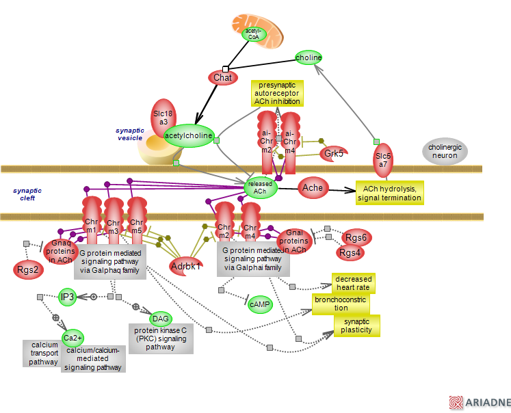 sporter Slc18a3, known as VACht. Upon release, ACh activates two types of receptors: the ionotropic nicotinic (nAChRs) and the metabotropic muscarinic (mAChRs) receptors. The signal is rapidly terminated by the hydrolysis of ACh carried out by the acetylcholine esterase Ache; the resulting choline is up-taken by the high affinity transporter Slc5a7, known as Cht1. Ache is a very fast acting enzyme and Ach clearance occurs in less than a millisecond. The ionotropic nicotinic receptors are part of the Cys-loop ligand-gated ion channel superfamily that form homo- and heteropentamers. The metabotropic muscarinic receptors are G-protein coupled receptors (GPCRs) that are subdivided into two families, depending on the type of G protein to which they couple. They derive their names because in addition to the endogenous ACh ligand they can be activated by nicotine, an alkaloid found in tobacco and other plants and by muscarine, a natural product of certain mushrooms. Signaling via muscarinic receptor type is the subject of this synopsis and presented in the diagram [click to see signaling via nAChRs; for an overall view of ACh, click here]. There are five muscarinic receptors Chrm1-5 of which the M1 family type is represented by Chrm1, 3 and 5 and the M2 family type by Chrm2 and 4. Click to see a PDB entry for the rat Chrm3 receptor bound to a drug; or the human CHRM2 receptor bound to an agonist. The M1 type couples to the Galphaq subunit of heterotrimeric G proteins; type M2 couples to the Galphai subunit. Galphaq mediated signaling involves the activation of phospholipase C and the subsequent production of IP3 and DAG. IP3 promotes an increase in intracellular calcium (Ca2+) and its subsequent signaling; DAG and in some cases Ca2+ activate protein kinase C (PKC) signaling. Galphai mediated signaling results in inhibition of adenylyl cyclases and reduction of cAMP levels. Muscarinic receptors are present both at the pre- and post-synapse and the cell membrane of effector tissues where they exert either an inhibitory or an excitatory effect. For instance, in the myocardium the activation of muscarinic receptors is inhibitory and leads to a decrease in heart rate whereas in the lung it has an excitatory effect causing the contraction of smooth muscle in the airways and prompting bronchoconstriction. In the brain, muscarinic activation plays a role in cognition and learning, memory and attention, and plasticity in the hippocampus. The M2 receptor type on the pre-synapse act as autoreceptors; the auto-inhibition of ACh release is a particular feature of the muscarinic system. The activation of both receptor types on the post-synapse translates in the modulation of various types of potassium channels as well as calcium and possibly sodium channels impacting on the excitability of those neurons. Like other GPCRs, the muscarinic receptors can form mono- and heterodimers and even interact with other GPCRs. GPCRs act as guanine exchange factors (GEFs) for the Galpha proteins promoting the exchange of GDP for GTP. The active, GTP-bound Galpha protein dissociates from the heterotrimeric complex to interact with and in turn, activate its effectors. The gamma/beta dimer can bind membrane-bound proteins to initiate what is referred to a fast ¿membrane-delimited pathway¿ affecting ion channels. Signaling is regulated both at the level of the receptor and of the Galpha proteins. Activated GPCRs are phosphorylated by GPCR specific kinases (GRKs); the phosphorylated receptors are recognized by beta ¿arrestin proteins whose binding precludes the re-association of receptors and G protein, thus accounting for the desensitization of receptor followed by its internalization. Adrbk1, known as GRK2, appears to regulate all mAChRs while others GRKs may target specific mAChRs subtypes. For instance, Grk5 appears to be the modulator of inhibitory pre-synaptic autoreceptors. While both Arrb1 and 2 beta-arrestin proteins play a role in muscarinic receptor function (not shown), the details and specificity of interactions need further investigation. The G proteins are target of RGS (Regulators of G proteins) proteins that act as guanine exchange factors (GAPs) to increase the hydrolysis of bound GTP leading to deactivation of G proteins whose own GTPase activity is slow. Rgs2 can target Galphaq to impact on Chrm3 activity while Rgs4 and 6 can target Galphai to impact on Chrm2 activity. However, like in in the case of arrestins, more studies are needed to delineate the specific contributions of GRKs and RGS proteins to the function of muscarinic system. Deregulation of mAChRs has been implicated in several conditions, including neurodegenerative, depression, schizophrenia and bipolar disorders. Exposure to organophosphates, compounds found in pesticides and insecticides, inhibit Ache leading to uncensored activation of both nAChRs and mAChRs. To see the ontology report for annotations, Gviewer and download, click here...(less)