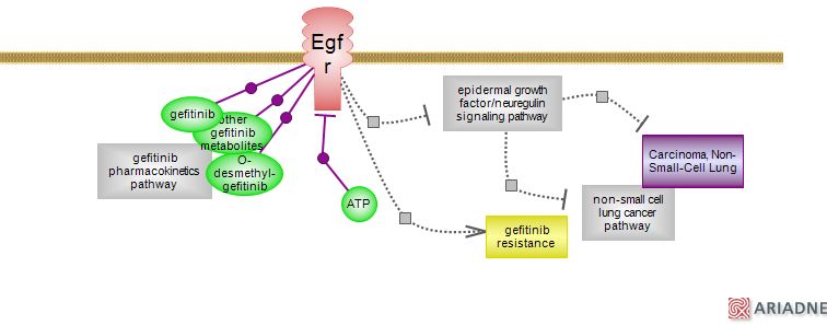 Gefitinib belongs to a class of tyrosine kinase inhibitors (TKI) designed to compete with ATP for binding into the ATP binding pocket of mutated or over-expressed receptor and thus inhibit its tyrosine kinase activity and the signaling events downstream of it. Gefitinib along with erlotinib have been used to target epidermal growth factor receptor, Egfr. Gefitinib, presented here, was among the first and the most widely used TKI for use in the treatment of locally advanced or metastatic non-smal
