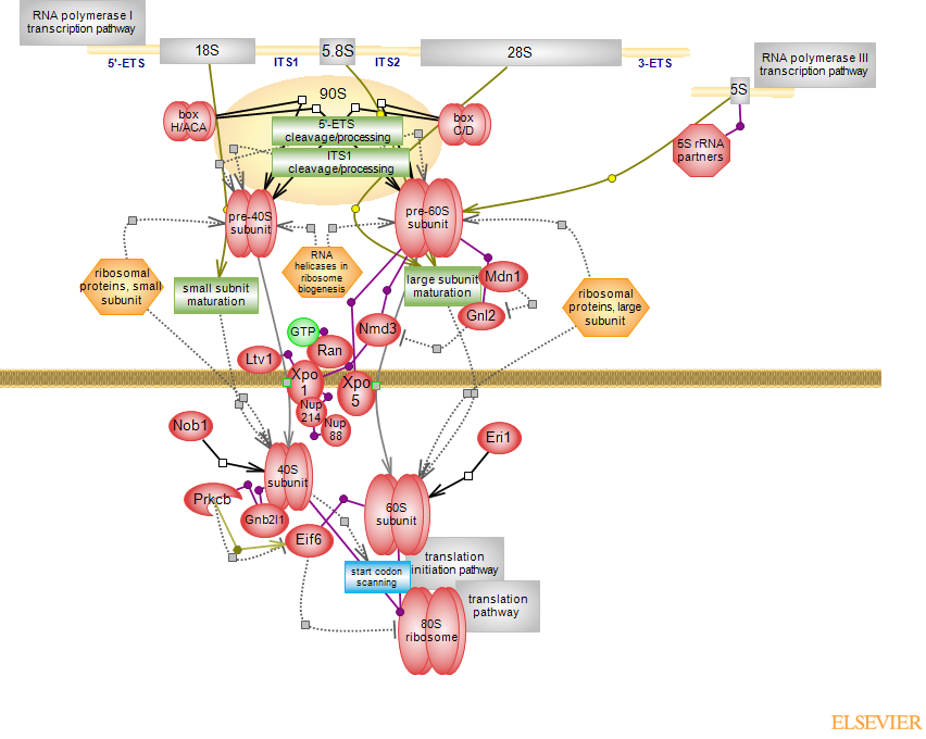 The initial stage of ribosome biogenesis is the transcription of ribosomal RNA (rRNA) genes. RNA polymerase I transcribes a large rRNA precursor that contains the mature 18S, 5.8S and 28S rRNAs, separated by internal (ITS) and flanked by external transcribed spacers (ETS). Of the three, 18S is the rRNA of the 40S subunit; the 5S rRNA component of the 60S subunit is transcribed by RNA polymerase III. As is transcribed, pre-rRNA associates co-transcriptionally with a subset of ribosomal and trans-acting proteins, with small nucleolar ribonucleotide particles (snoRNPs), folds and is subject to modifications while several endo- and exo-nucleolytic cleavage reactions will sequentially eliminate the spacers. Pre-rRNA maturation - the removal of internal and external spacers, is embedded within ribosome biogenesis. It starts with processing at the 5'-ETS site(s); the cleavage of an initial 90S pre-ribosome in the ITS1 spacer, produces the pre-40S and pre-60S ribosomal particles. From this point on, the two pre-ribosomal particles follow independent biogenesis and transport routes. The pre-40S undergoes relatively few compositional changes and is rapidly transported to the cytoplasm. In contrast, pre-60S associates with many trans-acting factors which, at various points during its biogenesis, are released and recycled. Site-specific pseudouridine formation and 2'-O-methylation of residues in regions important for ribosome function, are carried out by small nucleolar RNPs (snoRNPs). The presence of some is also required for initial cleavage reactions. The pol III transcribed 5S pre-rRNA is subject to 3'-exonuclease activity and assembles with a number of binding partners before joining the pre- 60S subunit either immediately delivered to the ribosome or arriving from a cytoplasmic pool. The ribosomal proteins of the small and large subunits assemble in a hierarchical fashion. Remodeling events along the ribosome maturation routes rely on the action of ATPases, GTPases, helicases, kinases and other protein classes. The two ribosomal subunits, independently exported to the cytoplasm, undergo final maturation. The transcriptionally competent 80S ribosome requires 40S, heavily regulated during the initiation phase of translation and 60S, recruited late during initiation, once the mRNA start codon has been located. Along the way, surveillance mechanisms assure its proper assembly, and the structural and functional integrity or, if necessary, its degradation. Defects in components of ribosome biogenesis result in a number of diseases collectively known as ribosomopathies. Several steps in the pathway are described.