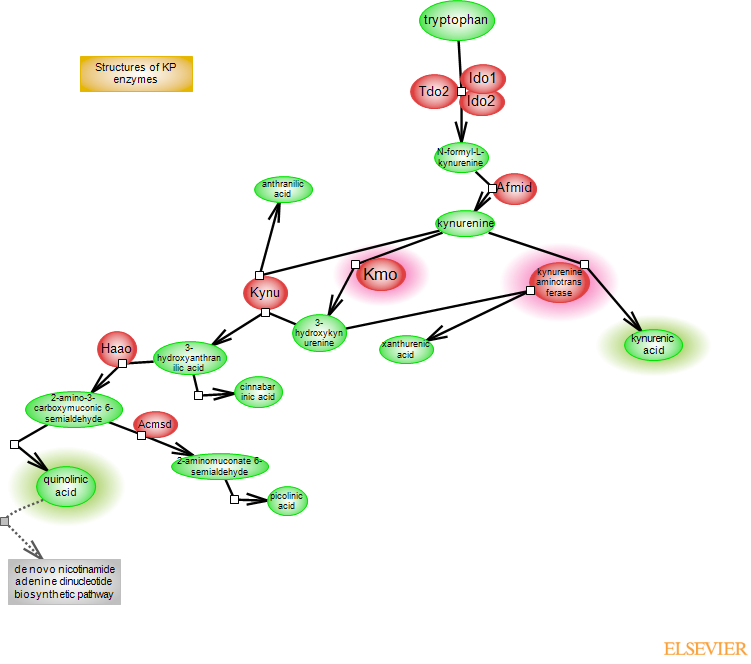3-dioxygenase (TDO2) and indoleamine-2,3 dioxygenase 1 and 2 (IDO1 and IDO2). The product of the reaction is N-formylkynurenine, converted to kynurenine (KYN) by arylformamidase (Afmid). KYN is a branching point for two metabolic routes. In one, it is converted to kynurenic acid (KYNA) by kynurenine aminotransferases (KATs). In the other, it initiates the production of quinolinic acid (QUIN). Here, KYN is hydroxylated to 3-hydroxykynurenine (3-HK) by kynurenine 3-monooxygenase (KMO). 3-HK is cleaved by kynureninase (KYNU) to 3-hydroxyanthranilic acid (3-HAA), which is then oxidized by 3-HAA oxygenase (3-HAO/HAAO) to 2-amino-3-carboxymuconic 6-semialdehyde (ACMS). ACMS spontaneously rearranges to quinolinic acid (QUIN). In the brain, the two routes are separated: KATs are primarily expressed in astrocytes whereas KMO is expressed in microglia. KYNA is an antagonist of NMDA and alpha7 nicotinic acetylcholine receptors, and may act as a radical scavenger. QUIN is the precursor of nicotinamide adenine dinucleotide (NAD+) coenzyme in the de novo NAD+ biosynthetic pathway. NAD+ is a widely-used coenzyme involved in redox reactions and is also used as a substrate by enzymes involved in posttranslational modifications. QUIN is a potentially neurotoxic metabolite; it selectively activates NMDA receptors and it can promote the production of reactive oxygen species (ROS). Other KYN metabolites include anthranilic acid (AA), metabolized from KYN by KYNU or xanthurenic acid (XA), metabolized from 3-HK by KATs. XA may have a role in hippocampal function. Cinnabarinic acid (CA) results from auto-oxidation of 3-HAA and could act as a partial agonist of metabotropic glutamate receptor 4. ACMS can be metabolized by ACMS decarboxylase (ACMSD) to 2-aminomuconate 6-semialdehyde (AMS), which rearranges to picolinic acid (PA). However, the expression of Acmsd is low and PA is not a major route of ACMS metabolism. Deregulation of the kynurenine pathway is associated with several neurological and neurodegenerative conditions. Neuroinflammation and microglia activation with increases in KMO activity and QUIN-dependent excitotoxicity have been associated with the pathogenesis of Huntington's disease (HD); elevated QUIN levels are also observed in other neurodegenerative conditions. On the other hand, despite its overall neuroprotective effects, elevated KYNA, due to its antagonistic impact on NMDA and cholinergic systems, can be detrimental. KMO polymorphism, decreased KMO expression and increased KYNA levels have been associated with bipolar disorder and schizophrenia. Enzymes in the kynurenine pathway are targets for drug development.