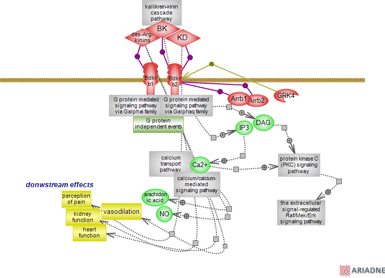 and 2, respectively. Receptor type 2 is ubiquitously expressed whereas type 1 is inducible. Bradykinin (BK) and kallidin (KD) are the preferred agonists of receptor type 2; their des-Arg-metabolites are the preferred agonists of receptor type 1. Both receptors couple to Galphai and Galphaq types of heterotrimeric G protein alpha subunits and can also signal independent of G proteins. Both trigger the activation of phospholipase B, the generation of diacylglycerol (DAG) and inositol 1,4,5-trisphosphate (IP3), the latter prompting the release of calcium from intracellular stores. DAG and calcium, separately or together stimulate protein kinase C (PKC) signaling which activates the Erk1/2 MAP kinase cascade. Via increased calcium concentration, the receptors stimulate nitric oxide (NO) synthase activities and NO production, phospholipase A2 stimulation and the production of arachidonic acid, prostaglandins and other inflammatory mediators, along with the pathways these molecules initiate. The receptors are subject to several types of post-translational modifications such as glycosylation and acylation and also phosphorylation; the latter also plays an important role in receptor desensitization. In addition to the Galpha subunits, the classical components of G protein signaling, the Gbeta/dimer, released upon GPCR activation, may also play a role in kinin mediated signaling. G alpha are active in the GTP-bound state and inactive in the GDP-bound state. The activated GPCR act as G protein exchange factors (GEF), that promote the release of GDP and binding of GTP and the subsequent release of activated Galpha subunit which now can activate its own effectors. G protein kinases (GRK) phosphorylate activated receptors which are then recognized by arrestin proteins whose binding precludes the re-association with G proteins thus inducing the desensitization of GPCRs. Of the many GRKs involved in GPCRs desensitization, Grk4 is the one involved in the kinin receptors mediated pathways. Although the two receptors appear to couple to similar intracellular signaling pathways, there is nonetheless a distinction between their signaling modes. Receptor type 1 is induced under certain conditions, is not significantly phosphorylated, is desensitized to a limited degree, appears to have a different distribution in the plasma membrane and is not significantly internalized; in addition, it does not appear to be present in sensory neurons. Several polymorphisms have been described for both receptors of which some have been associated with pathophysiological conditions. To see the ontology report for Gviewer, annotations and download, click here ...(less)