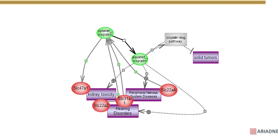 ells like cancer cells. Both p53-dependent and independent routes of apoptosis activation are reported; necrotic-like cell death can also occur. Some tumors however, develop resistance while others may not respond to treatment. For instance, increased NER activity (repair rather than apoptosis) can lead to decreased sensitivity/increased resistance to drugs. Processes that affect the intracellular concentration of drugs can also contribute to drug sensitivity or resistance. In addition, the response can be toxic to non-cancer cells. The relative efficacy and/or toxicity as well as the molecular details of DNA lesions exhibited by the three drugs are different. Cisplatin appears to have the lead in terms of both potency and the toxicity of its side effects. Peripheral neurotoxicity, nephrotoxicity and ototoxicity are among the most severe cisplatin reported side effects. The cisplatin response pathway - the toxic effects of the drug and the drug are presented in this diagram; the pharmacokinetics/pharmacodynamics are presented in a related diagram. Once inside the cells, cisplatin becomes aquated by the gain of two molecules of water and as such is capable of interacting with nucleophilic molecules such as RNA, proteins, phospholipids and DNA, which is its primary target. Cisplatin promotes similar events in somatic, non-cancer cells as it does in cancer cells and exposure/accumulation due to increased expression of transporters, decreased expression of DNA repair genes, mutations or otherwise epigenetic or regulatory differences that render certain cells/tissues more prone to undergo apoptosis can underlie the toxic effects observed. Accumulation of cisplatin in the kidney, primarily in the tubules leads to impairment in proximal tubules, altered renal hemodynamics and is manifested in the acute and/or chronic nephrotoxic response. In the ear, cisplatin targets several areas in the cochlea including the hair cells in the organ of Corti which are the site of auditory mechanotransduction thus accounting for its ototoxic effect. The hearing loss associated with cisplatin treatment can lead to deafness and is particularly severe in young children. The incidence of ototoxicity, reported to be between 23-50% in adults, is greater than 50% in children. The neurotoxic effect includes symptoms such as numbness, distal paresthesias (tingling in extremities) and sensory ataxia. The mechanisms are not well understood but accumulation of cisplatin in dorsal root ganglia (DRG) may lead to the atrophy and/or loss of peripheral sensory neurons. Transporters whose expression is high in the cells of these tissues can play a role in the toxic effects associated with cisplatin treatment. The main influx cisplatin transporter is the high affinity copper transporter of the solute family 31 - Slc31a1, known as Ctr1. The transporter is highly expressed in the kidney and is also found in several cochlear structures including the organ of Corti. Ctr1 mRNA has been found in rat DRG and the expression of Ctr protein was found in a subpopulation of large-size DRG neurons that became atrophied upon cisplatin treatment. Thus, Ctr1 which is critical for the cisplatin tumor response, can also be responsible for its toxic effects. The members of the Slc22A family include organic cation (OCTs), organic cation/carnitine (OCTNs) and organic anion transporters (OATs). Of the three OCT genes, the OCT2 is highly expressed in the kidney; uptake of cisplatin in cells transfected with human Oct2 induced apoptosis; the involvement of Oct2 in renal cisplatin toxicity is also evidenced in studies using animal models. Oct2 is also expressed in the cochlea and deletion of this gene protected mice from ototoxicity. Slc47a1, known as Mate1 is a member of the multidrug and toxin extrusion transporter Slc47 family; it is expressed in the kidney and may mediate the renal efflux of cisplatin. The nephrotoxicity of cisplatin was increased in a mouse Mate1 null compared to the wild type and the renal accumulation of cisplatin was also significantly higher. In rat DRG, the expression of Slc22a4/Octn1 and Slc22a5/Octn2 is observed and cells overexpressing the rat and human genes can mediate platinum derivatives uptake, although Octn1 may be the main carrier. Thus, Slc31a1/Ctr1 is possibly implicated in all three toxic effects of cisplatin, Slc22a2/Oct2 may play a role in nephrotoxicity and ototoxicity, Slc47a1/Mate1 in nephrotoxicity and Slc22a4/Octn1 in neurotoxicity. To see the ontology report for annotations, Gviewer and download, click here...(less)