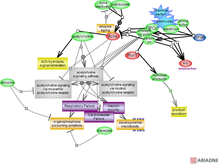 tylcholinesterase AChE resulting in uncensored acetylcholine (ACh) signaling. ACh is a neurotransmitter and neuromodulator that plays important roles in the central and peripheral nervous system and also in non-neuronal cells. It performs its manifold functions by activating the ionotropic nicotinic (nAChRs) and the metabotropic (mAChRs) receptors. [To see acetylcholine signaling via nicotinic receptors click here, via muscarinic receptors, click here and for an overall depiction of the acetylcholine system, click here]. The signal is terminated by the hydrolysis of ACh by Ache - a very fast acting enzyme accounting for ACh clearance in less than a millisecond (click the see the structure of the apo human enzyme; or in combination with the anti-Alzheimer drug Donepezil. OPCs poisoning leads to neuronal excitotoxicity and damage and affects the cardiovascular, musculoskeletal, respiratory and gastrointestinal systems. A primary cause of death is respiratory failure due to muscle paralysis, bronchial and brain respiratory systems dysfunction; cardiovascular failure can also occur. In vivo and in vitro studies in rats show a range of developmental neurotoxic effects of OPCs. Structurally, OPCs are ester, thiol or amide derivatives of phosphoric acid, phosphonic acid or phosphinic acid and hundreds different compounds are available. The mechanism of Ache inactivation involves the formation of a covalent bond between the OPC's phosphoryl group and the hydroxyl group of a serine residue in the active site of Ache; the inactivation is largely irreversible. Some of the extensively used insecticides, such as parathion and chlorpyrifos are phosphorothionates. The oxidative desulfuration of P=S moiety is carried out by members of the cytochrome P450 family, CYP2B6 primarily. The resulting 'oxon' metabolites - paraoxon and chlorpyrifos oxon, respectively, are the potent Ache inhibitors. Some OPCs metabolism is carried out by paraoxonases - arylesterases that can hydrolyze OPCs. Pon1 is a primary esterase; the calcium-dependent enzyme catalyzes the hydrolysis of cyclic lactones such as homocysteine thiolactone. Pon1 has a broad substrate specificity which probably accounts for its activity towards OPCs and other xenobiotics (click to access the PDB entry for the crystal structure). The finding that the parathion derived paraoxon metabolite is a substrate for PON1, lead to its identification as a phosphotriesterase. Parathion, still in use in parts of the world, has been banned in the United States and other countries; its place taken by the related but less toxic methyl parathion. Several approaches are used to counteract OPCs poisoning (OPP), largely with relative efficacy. Oximes, also known as cholinesterase reactivators, are chemical compounds aiming at restoring (reactivating) the Ache by splitting the OPC-enzyme bond. Of the several commercially available, pralidoxime is the most commonly used. Their efficacy varies and many do not cross the blood-brain barrier thus limiting their effect on the central nervous system. Oxime administration must be fast as the phosphorylated Ache can undergo 'aging' - a time-dependent loss of one alkyl group bound to phosphorous which prohibits the reactivation reaction. Other approaches do not involve actual anti-OPCs but are used because their actions can alleviate some of the symptoms of PCs, poisoning. They include atropine - a competitive antagonist for the muscarinic receptors that reduces several of the symptoms and diazepam, one of a class of benzodiazepines with depressant functions, as an anticonvulsant. A standard therapy consists of combinations of oximes, atropine and diazepine. In addition to Ache, OPCs form adducts on several other proteins, the most notable example being albumin. The phosphorylated tyrosine - documented in humans and mice, is not subject to aging or substrate for oximes; this coupled to the high abundance and long half-life of the protein renders albumin as useful biomarker for OPC exposure despite a lower reaction rate, compared to Ache. click to see the ontology report for annotations, GViewer and download....(less)