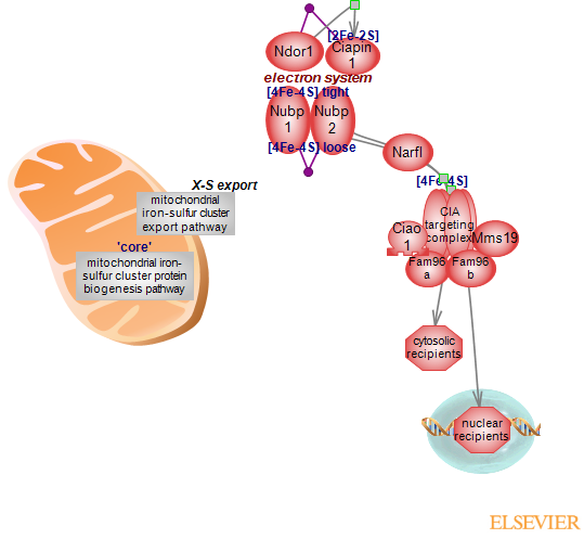 A species still to be characterized, referred to as 'X-S', is delivered to the cytosol by the mitochondrial export pathway that includes the Abcb7 transporter, glutathione and the FAD-dependent intermembrane Gver (known as Alr) sulfhydryl oxidase. An initial [4Fe-4S] cluster is assembled on a scaffold composed of two P-loop NTPases, Nubp1 and 2, forming a heterotetramer. A loosely bound [4Fe-4S] is coordinated by a conserved motif at the C-terminus of Nubp1. A tightly bound [4Fe-4S] is coordinated by a ferredoxin-like motif at the N-terminus of Nubp1. As in the mitochondrial pathway, electrons need to be supplied and the CIA electron system is composed of Ndor1 diflavin protein and the Fe-S protein Ciapin1. The two proteins interact with each other. Based on EPR studies of the yeast counterpart, electrons from NADPH are transferred to the [2Fe-2S] of Ciapin1 via the FAD and FMN centers of Ndor1. Release of [4Fe-4S] from the Nubp complex is followed by its transfer and insertion into recipient proteins. It requires the presence of Narfl (known as IOP) for transfer and the CIA targeting complex composed of Ciao1 (known as Cia1), Fam96a and b (known as CIA2A and B, respectively) and Mms19 proteins for insertion. Particular combinations of targeting proteins deliver the cluster to specific cytosolic and nuclear recipient apoproteins. Fam96a (CIA2A), for instance, is dedicated to the insertion of [4Fe-4S] into the iron regulatory protein ACO1 (known as IRP1) and maturation of the aconitase holoprotein. The dual function ACO1 (IRP1), and IRP2, are involved in the post-transcriptional control of iron homeostasis. Many molecular aspects of the CIA pathway remain to be characterized.