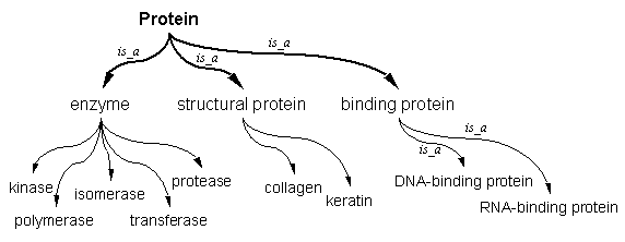 | Ontologies, as used in a biomedical context, are controlled vocabularies in which a set of related concepts and ideas that are relevant to a field are organized in a hierarchical fashion, similar to an outline. The more general concepts are placed in the higher levels and more specific concepts are assigned to lower levels. In a simple ontology of concepts relating to proteins, we might find the following terms: protein, enzyme, structural proteins, kinase, polymerase, binding protein, isomerase, collagen, transferase, keratin, DNA-binding protein, RNA-binding protein, protease. In the ontology, they might be organized as follows: Protein would be at the top of the hierarchy being the most general concept. Directly under that would be enzyme, structural protein, and binding protein. Under enzyme then would be the concepts kinase, polymerase, isomerase, transferase, protease. Similarly, collagen and keratin would fall under structural protein, etc.