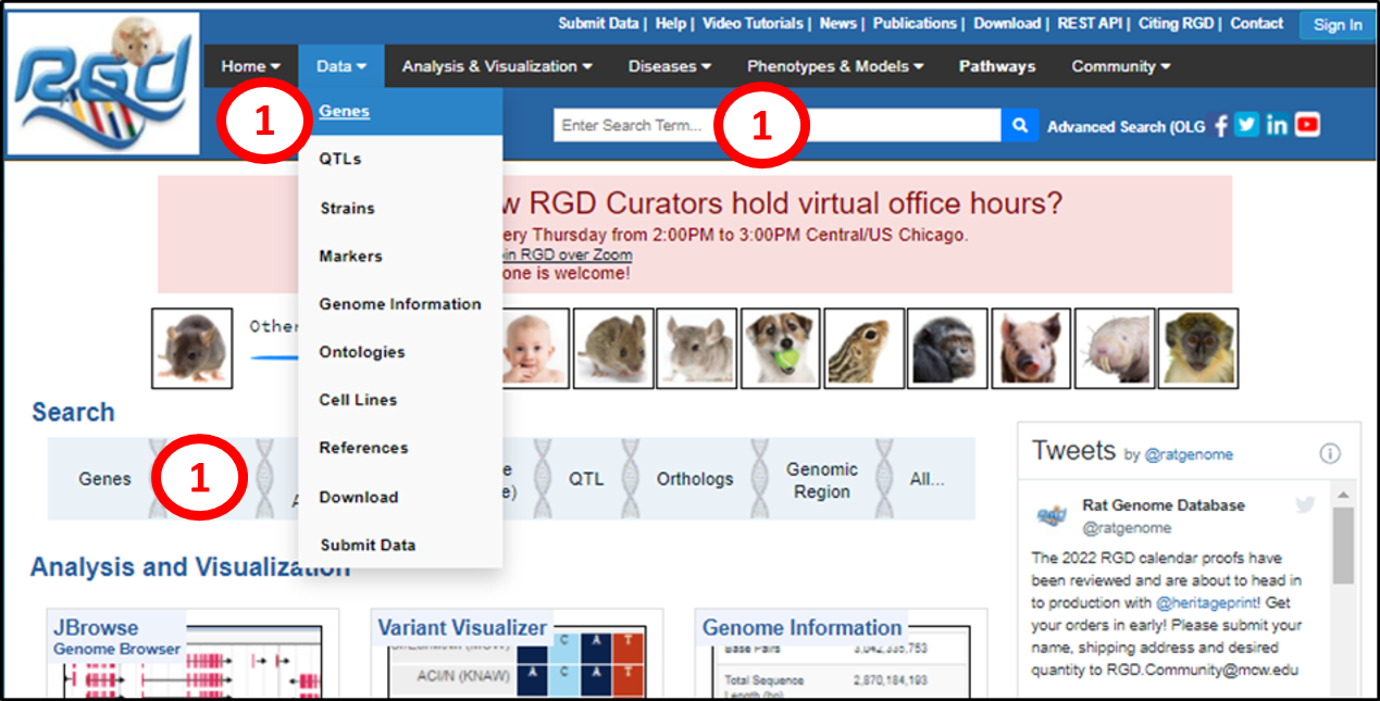 1. Gene report pages can be accessed from the RGD front page in several ways. One can type a case-insensitive gene symbol or name into the “Search Term” box and press enter or click the magnifying glass icon, or click on “Genes” in the “Data” pulldown in the black toolbar, or on “Genes” in the light blue Search bar.