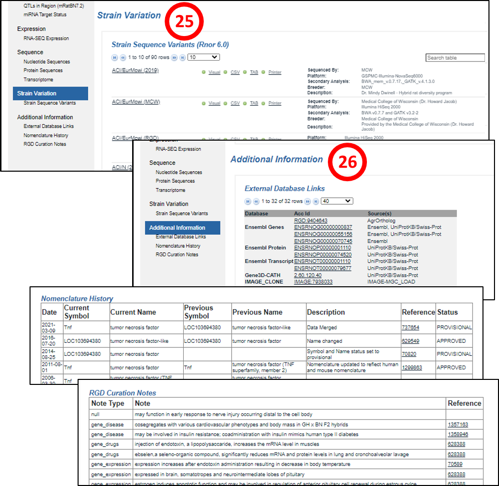 26. Additional Information section: this is composed of one to three subsections, “External Database Links”, listing a variety of databases with links that house different kinds of data on the gene, “Nomenclature History” (rat and human gene report pages), providing the gene name status and any previous names and “RGD Curation Notes” (rat gene report pages), legacy curator-provided descriptive information on the gene.