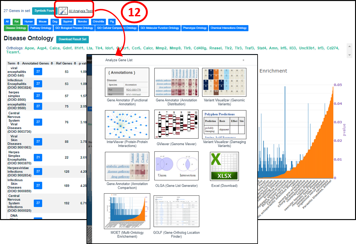 1. The RGD home page icon or ‘Analysis & Visualization’ menu and; 2. Individual disease portal pages from ‘Diseases’ and ‘Disease Portals’. For help with the RGD Disease Portals click here. MOET is also available on RGD gene report pages. |