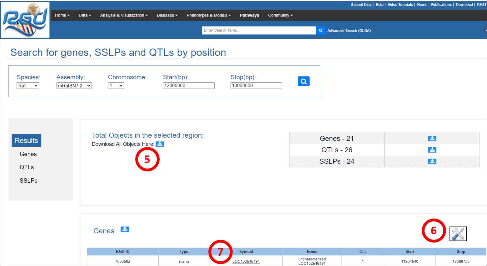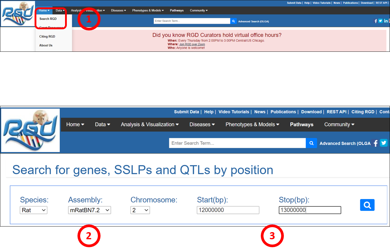 There are a variety of ways to get to the information within the Rat Genome Database. The two most general methods provide the user an option to use a keyword or coordinates. The general keyword search function provides results based on matches such as locations, experimental data, descriptions (i.e. ASSOCIATED WITH hypertension (ortholog)), synonyms/aliases, database IDs, origin, name (i.e. spontaneous hypertension rat), trait, terms and term definitions, citations, titles, or abstracts. An advanced search function is available through OLGA.