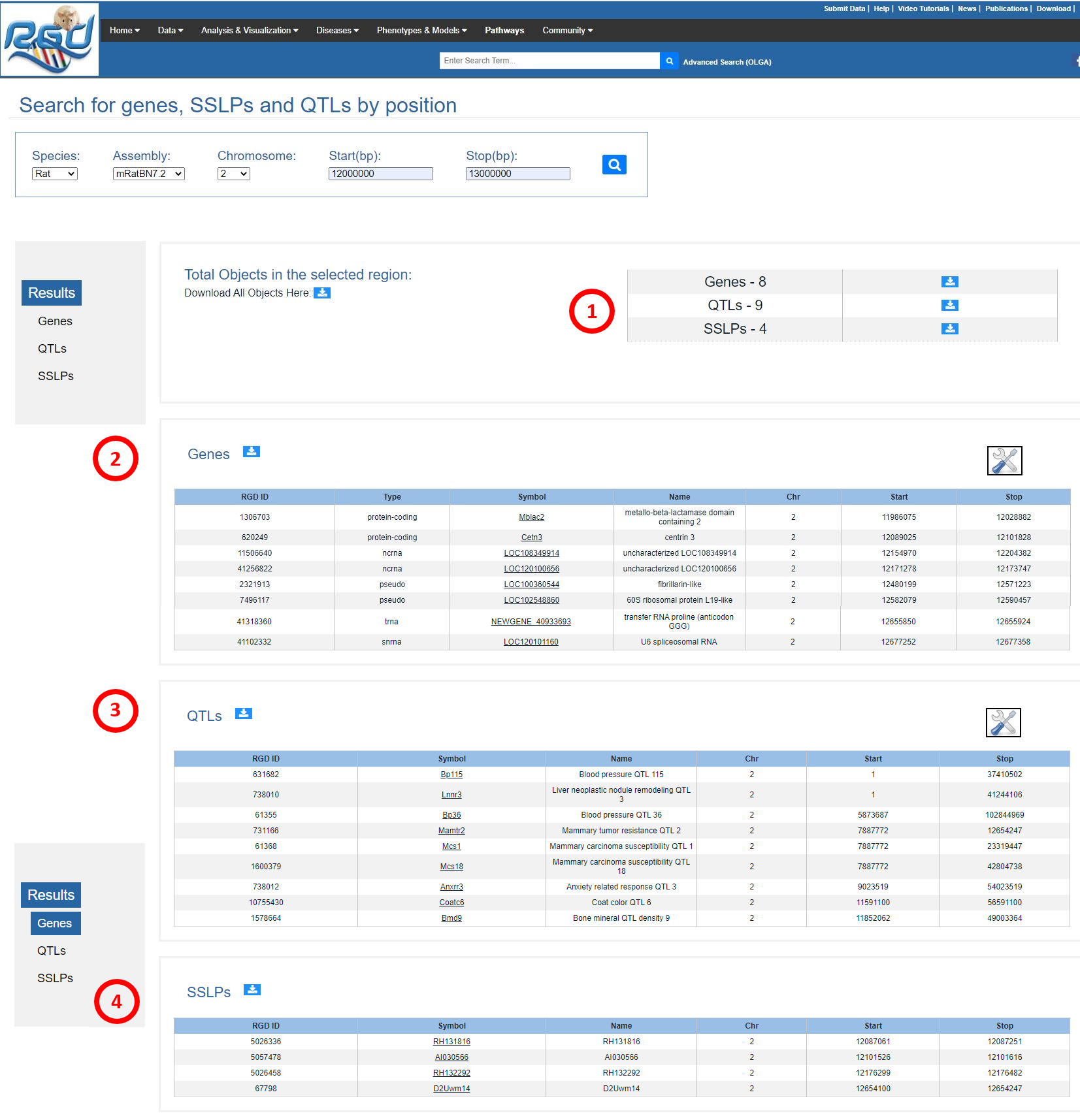 There are a variety of ways to get to the information within the Rat Genome Database. The two most general methods provide the user an option to use a keyword or coordinates. The general keyword search function provides results based on matches such as locations, experimental data, descriptions (i.e. ASSOCIATED WITH hypertension (ortholog)), synonyms/aliases, database IDs, origin, name (i.e. spontaneous hypertension rat), trait, terms and term definitions, citations, titles, or abstracts. An advanced search function is available through OLGA.
