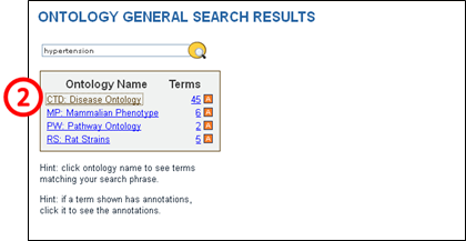 | 1. In the ‘Ontology General Search’ page that comes up, enter ‘hypertension’ in the search box in the upper center of the page. Click ‘Search’ to the right of the search box or press ‘Enter’ on your keyboard. | ||||