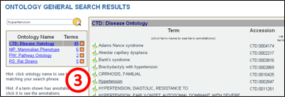 | 2. This will return an ontology term results list. To access the disease terms, click ‘CTD: Disease Ontology’. | ||||