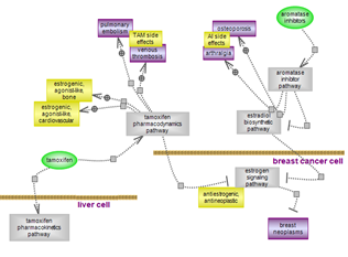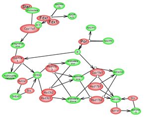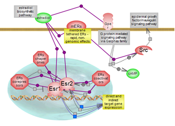 Estradiol, the main C18 estrogen, is primarily synthesized in the ovaries and like all steroid hormones is derived from cholesterol. Click here to examine the metabolic pathway of estradiol biosynthesis where a link is also provided to access the entire suite of hormone biosynthetic pathways. Estrogen signaling plays essential roles in female sexual development and reproductive functions and is also important in bone and cardiovascular systems and in brain functions. Click here to explore this important signaling pathway. Estrogen has been implicated in the growth and development of breast cancers. Anti–estrogen approaches include the development of drugs that target the receptors, such as tamoxifen, and those that target the biosynthesis of estradiol, such as the aromatase inhibitors. Click here to access the overall anti-estrogen drug pathway and the connection it provides to tamoxifen and aromatase inhibitor pathway diagram pages.