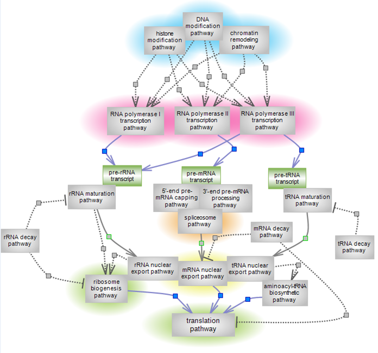| Intimately connected to transcription are many of the pre-transcript maturation and nuclear export events. Particularly in the case of mRNA, 5’ pre-mRNA and 3’ pre-mRNA processing are coupled to initiation of transcription elongation and termination, respectively. Most mRNAs contain introns whose splicing is largely co-transcriptional and for which the end of one splicing cycle couples to the export of mature mRNA. tRNA and rRNA maturation occur both in the nucleus/nucleolus and in the cytoplasm. rRNA maturation, the production of the four rRNA genes, is coupled to the generation of the pre-ribosomal 40S and 60S particles. The particles are exported to the cytoplasm where the final steps of ribosome biogenesis yield the translation-competent ribosomes. Along the way, surveillance mechanisms are in place for quality control (QC) of the correctness of RNA molecules and initiate decay or recycling events, as necessary. Completion of ribosome biogenesis and aminoacylation of tRNA fuel the translation of mRNA into a peptide chain followed by its folding into the protein structure, protein post-translational modification and delivery to site(s) of action. The spliceosome pathway is highlighted in orange; the pathway of mRNA nuclear export is highlighted in yellow; the ribosome biogenesis and translation pathways are highlighted in green. |