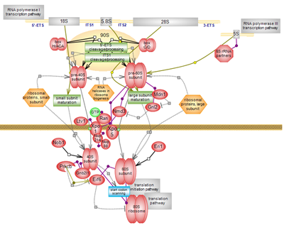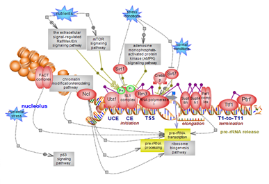 | Nucleolar RNA polymerase I transcription has one gene as its target: the large 47S ribosomal gene whose transcript is further processed into the three mature 18S, 28S and 5.8S rRNAs. Multiple copies of the gene are distributed in clusters on several chromosomes. As part of the highly energy-consuming process of ribosome biosynthesis, the rRNA transcription pathway is highly regulated at multiple levels. Click here to explore this important regulatory pathway. |