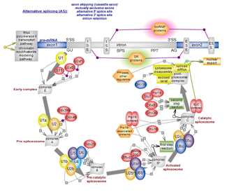 The spliceosome – the multimegadalton ribonucleoprotein complex, is one of the most elaborate macromolecular machines of the cell. Five small nuclear ribonucleoprotein particles (snRNPs) assemble in discrete complexes along a dynamic, energy-fueled pathway. Substantial structural and functional rearrangements along this route promote the catalytically competent spliceosomes that perform the two esterification reactions that excise intervening introns and ligate the exons of pre-mRNAs transcribed by RNA polymerase II. Splicing is largely co-transcriptional, and most genes in higher eukaryotes are subject to alternative splicing (AS). Alternative exons can be included or skipped, alternative 5’ and 3’ splice sites can be used and certain introns can be retained. AS vastly expands the repertoire of proteins and the range of their functional versatility. Chromatin dynamics and structure impact on transcription, splicing and alternative splicing. Splicing, in turn, affects transcriptional rates and the modulation of chromatin configuration. The pathways of transcription, splicing and chromatin modification and remodeling are entwined in a continuous, bidirectional partnership. Click here to explore the intricate spliceosomal pathway. |