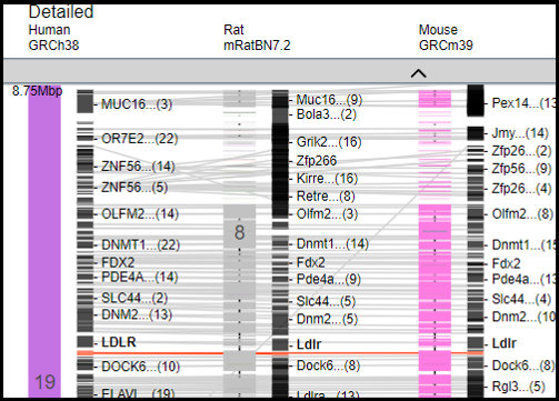 | The Virtual Comparative Map (VCMap) is a tool for exploring conserved synteny between species, including rat, mouse and human. | For a list of genes, find the terms from any or all of the ontologies used by RGD for gene curation (Disease, Pathway, Phenotype, GO, ChEBI) that are over-represented in the annotations for those genes, or for orthologs in other species. Click here for help getting started with RGD’s MOET. |