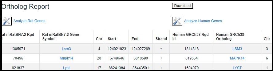 | For a list of gene symbols or IDs, or a chromosomal region, retrieve all functional annotations for the genes and their orthologs, as well as links to additional information at other databases. | For a list of genes, find the orthologs in another species, and retrieve the genomic positions of the genes in both species. |